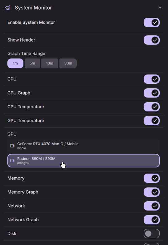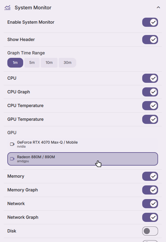 A configurable system monitor that can display CPU, memory, GPU, disk, network, process, temperature, and other system information in a variety of formats.