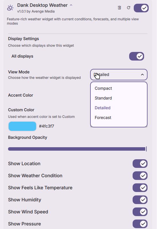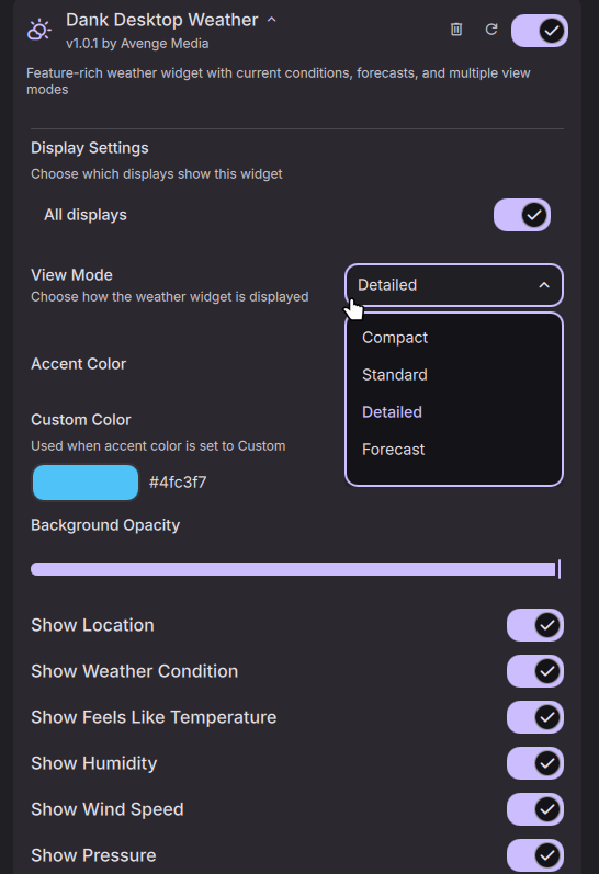 There is one first-party plugin that is now available on the registry: Dank Desktop Weather (requires DMS git/nightly). This plugin adds a weather widget to your desktop that shows current weather conditions and forecasts.