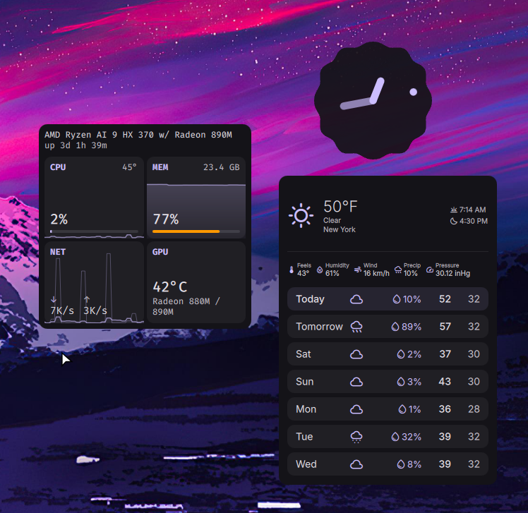 The next DMS release has a new type of widget and plugin, Desktop Widgets. These are little applets that live on your desktop, below your windows and above your wallpaper.