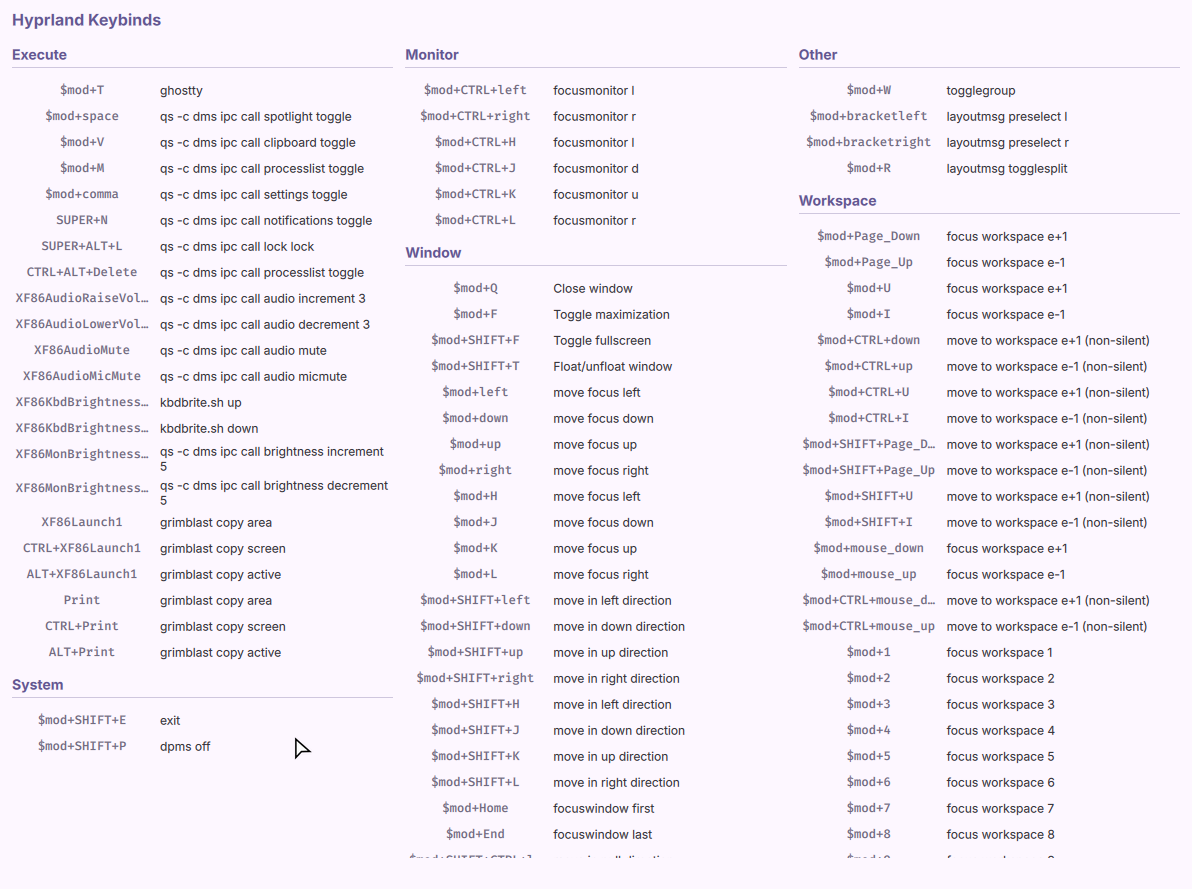 [hidden]comments to exclude certain binds - Categorizes binds by type (Window, Workspace, Execute, etc.)